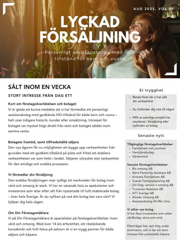 Sedan 14 år tillbaka är vi på Din Företagsmäklare en ledande företagsmäklare specialiserad på vård- och omsorgssektorn. Vi förmedlar företag till salu inom hemtjänst, assistans, familj- och jourhem, LSS, HVB och vårdcentraler över hela Sverige.